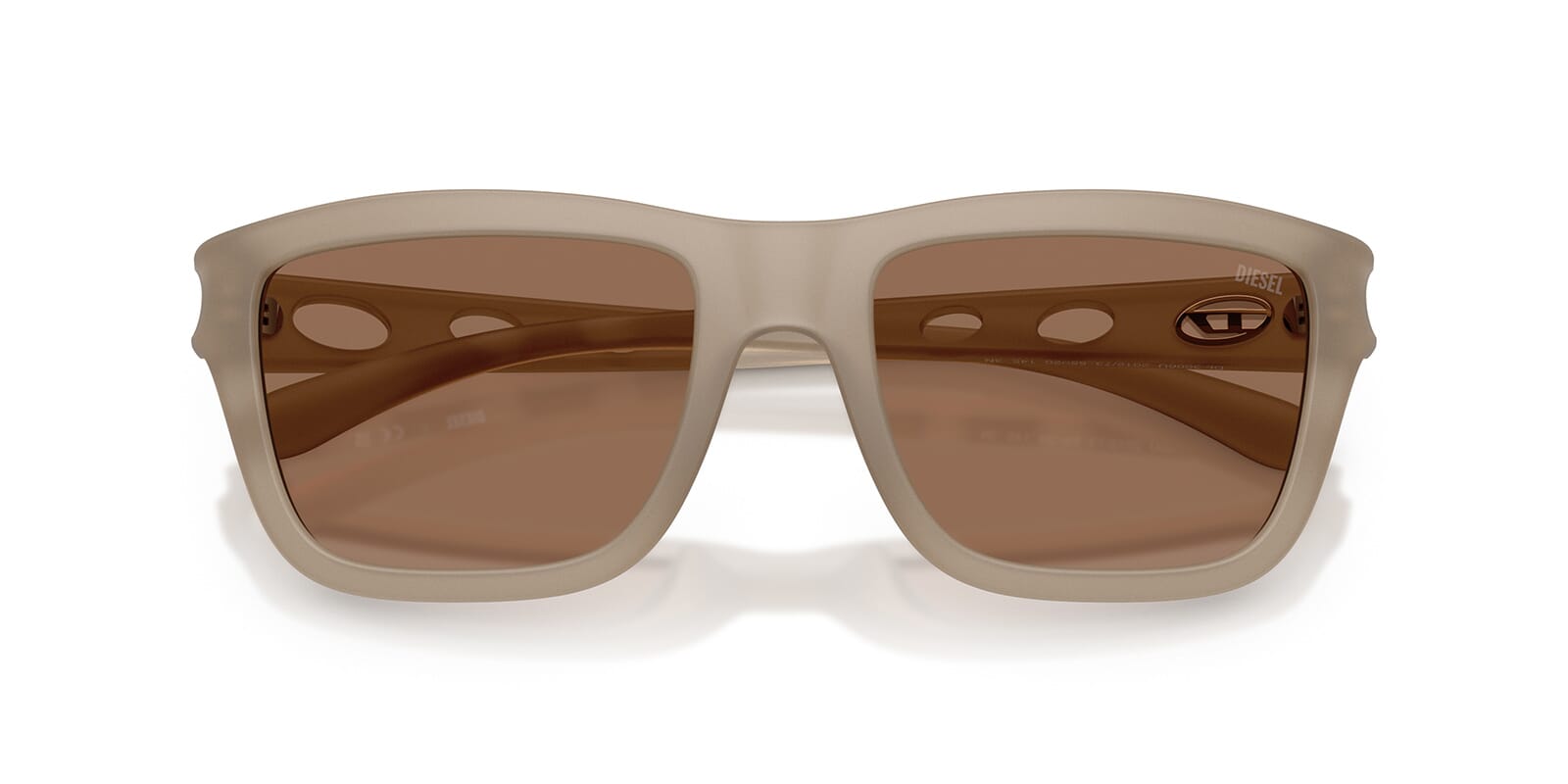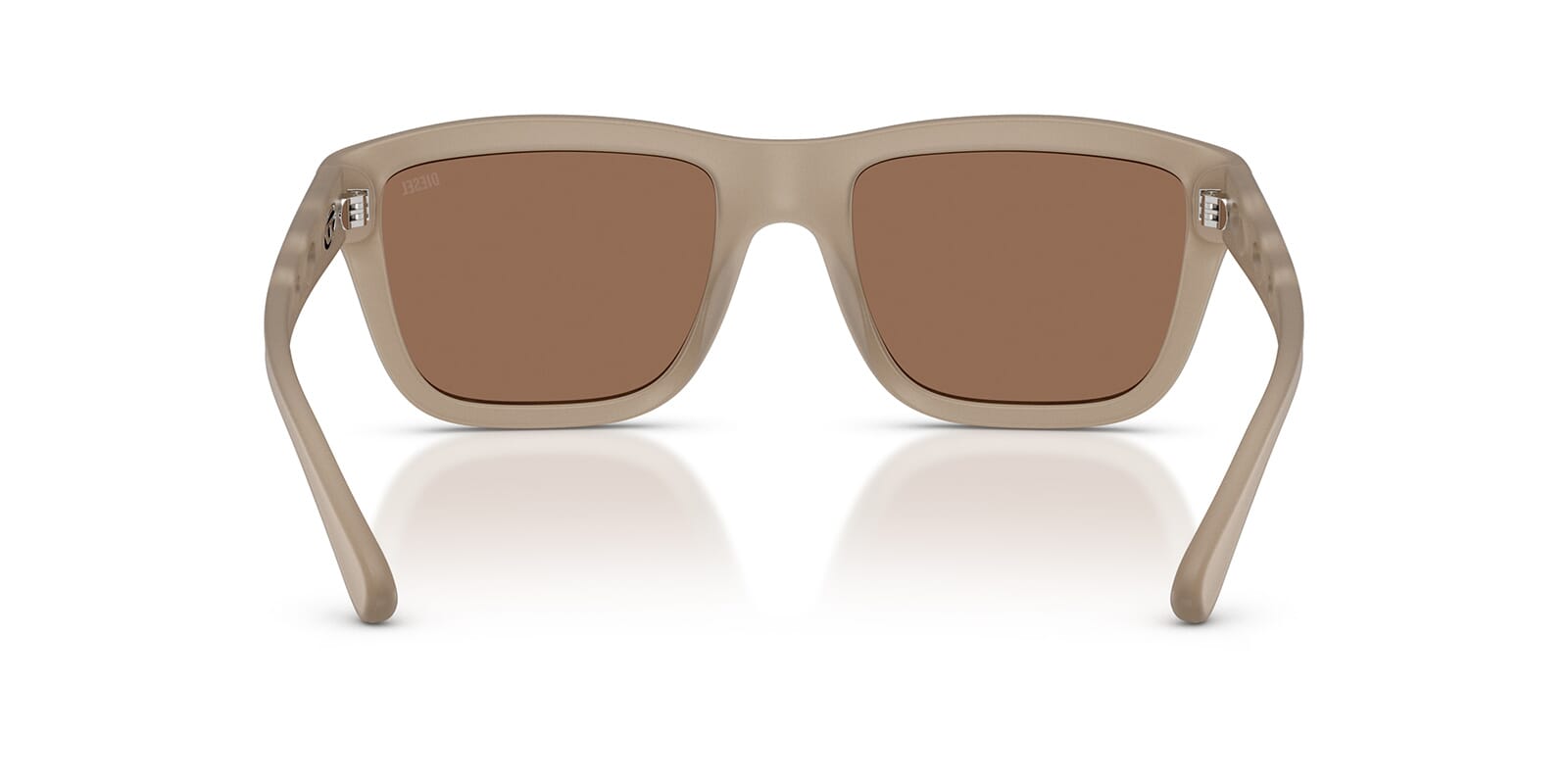 This square Diesel sunglass comes in a opal grey crystal frame with dark brown lenses.