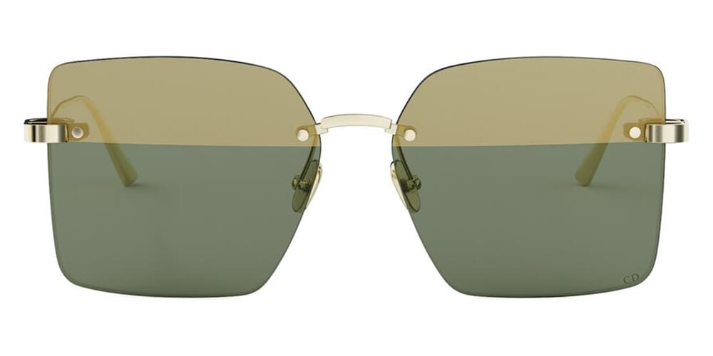 This square Dior sunglass comes in a shiny gold frame with light green with semi yellow mirror lenses.