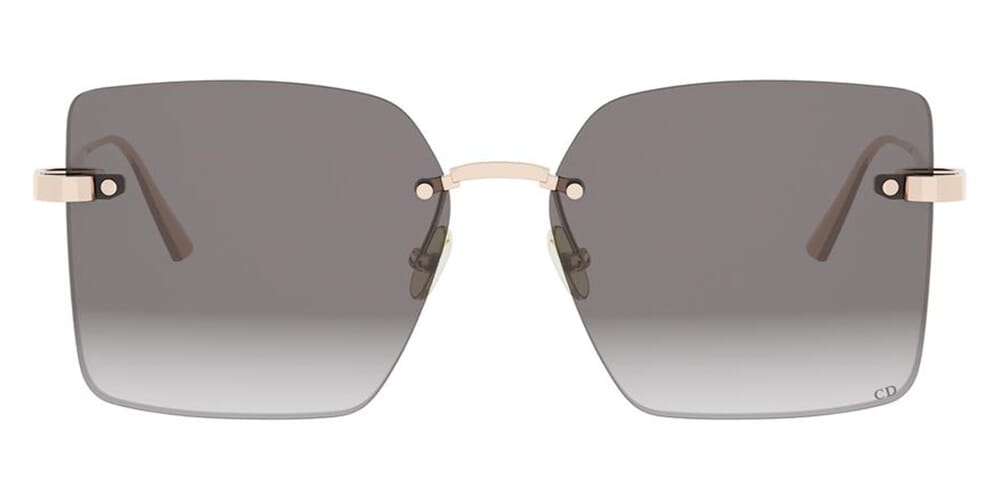 This square Dior sunglass comes in a shiny rose gold frame with grey lenses.
