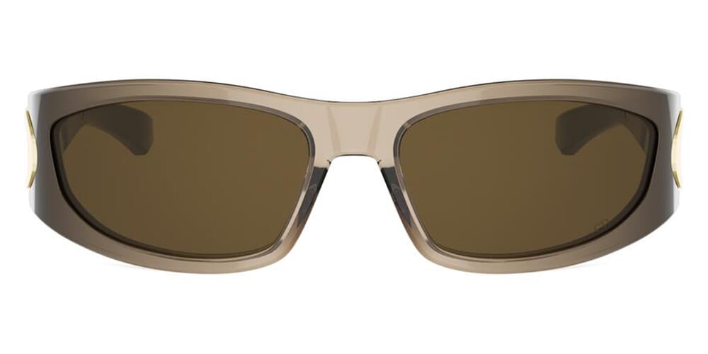 This wraparound Dior sunglass comes in a crystal brown with black frame with brown lenses.