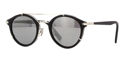 This square Dior sunglass comes in a shiny black with silver frame with grey lenses.