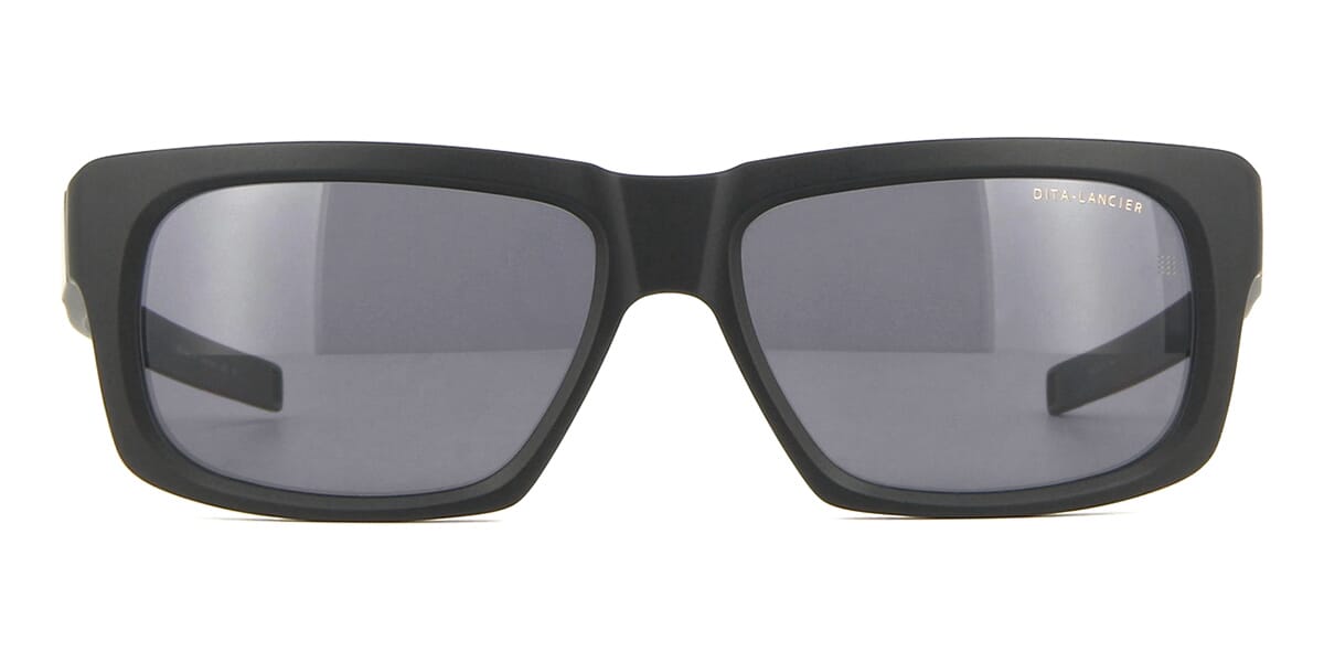 This square Dita Lancier sunglass comes in a matte black frame with sea grey polarised lenses.