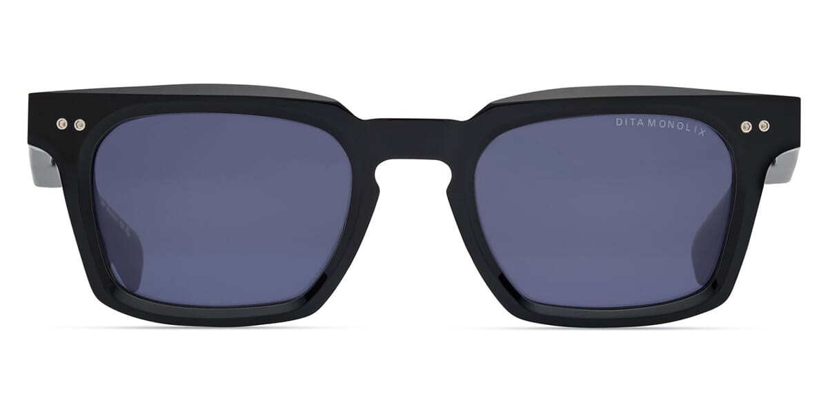 This square Dita sunglass comes in a shiny black frame with midnight blue lenses.