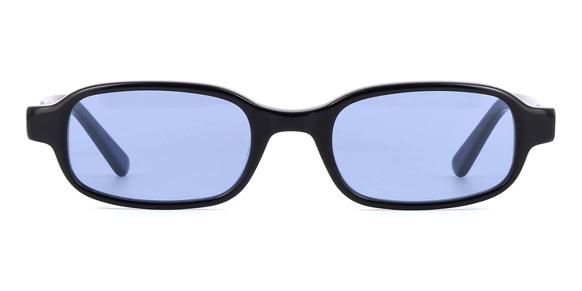 This square DMY Studios sunglass comes in a shiny black frame with light blue lenses.