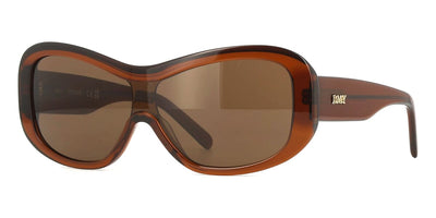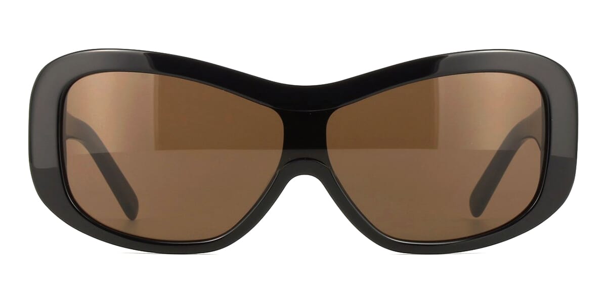 This shield DMY Studios sunglass comes in a shiny black frame with brown with light mirror lenses.
