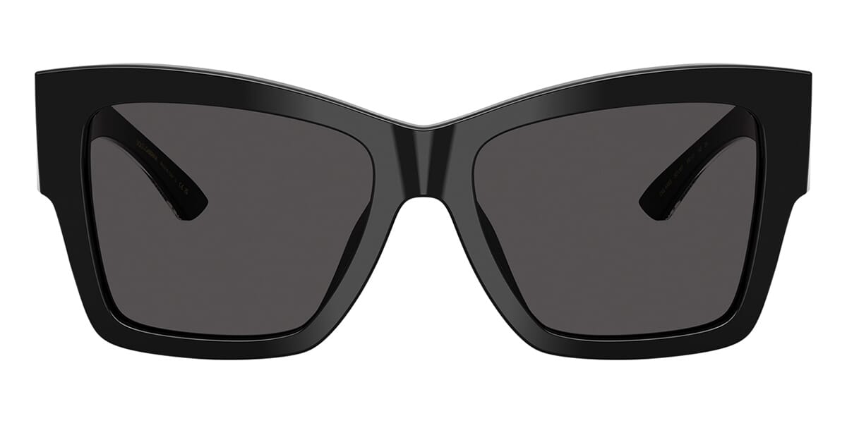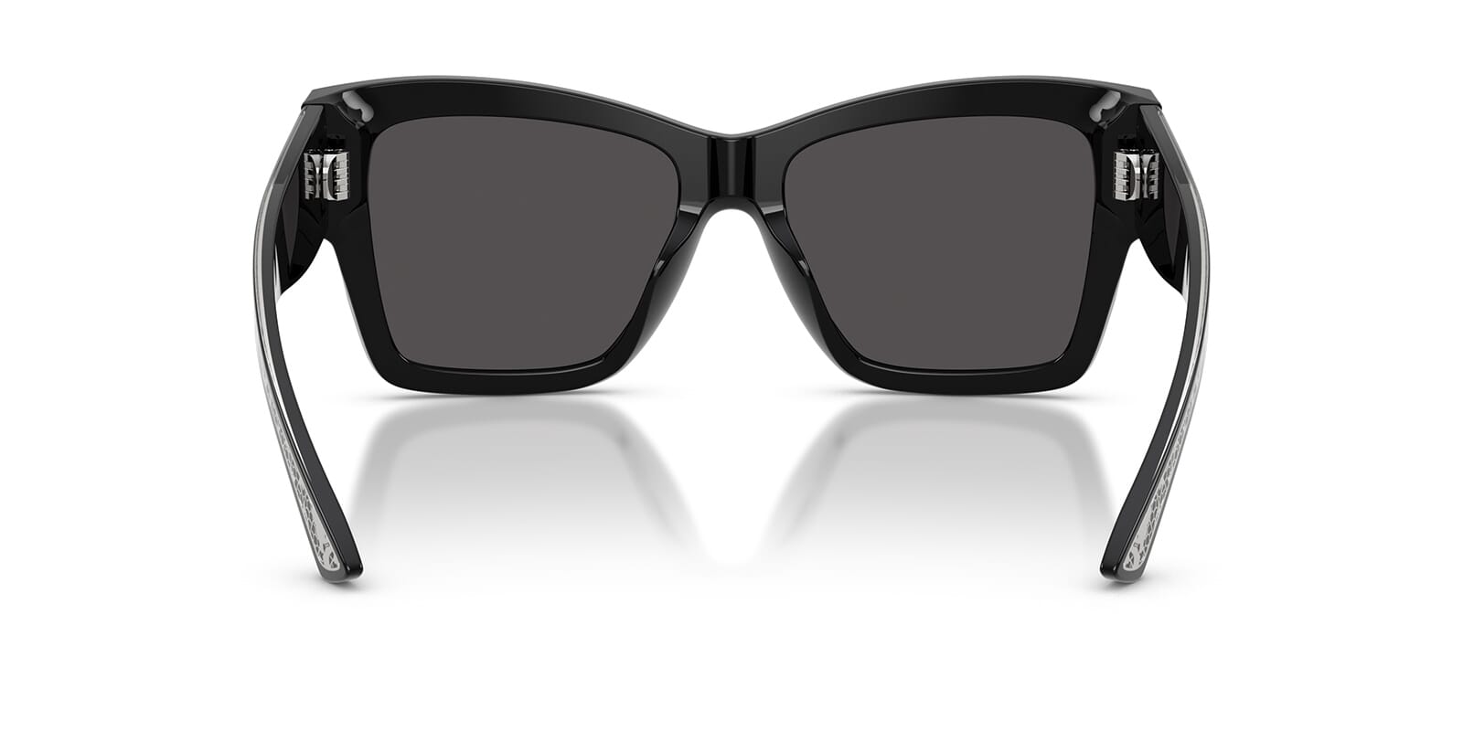This square Dolce&Gabbana sunglass comes in a black frame with dark grey lenses.