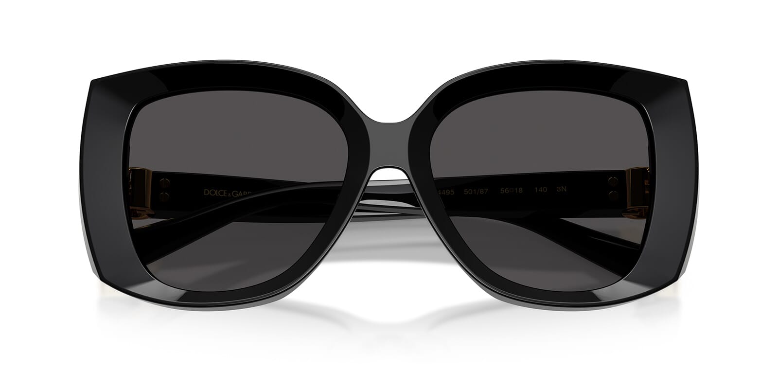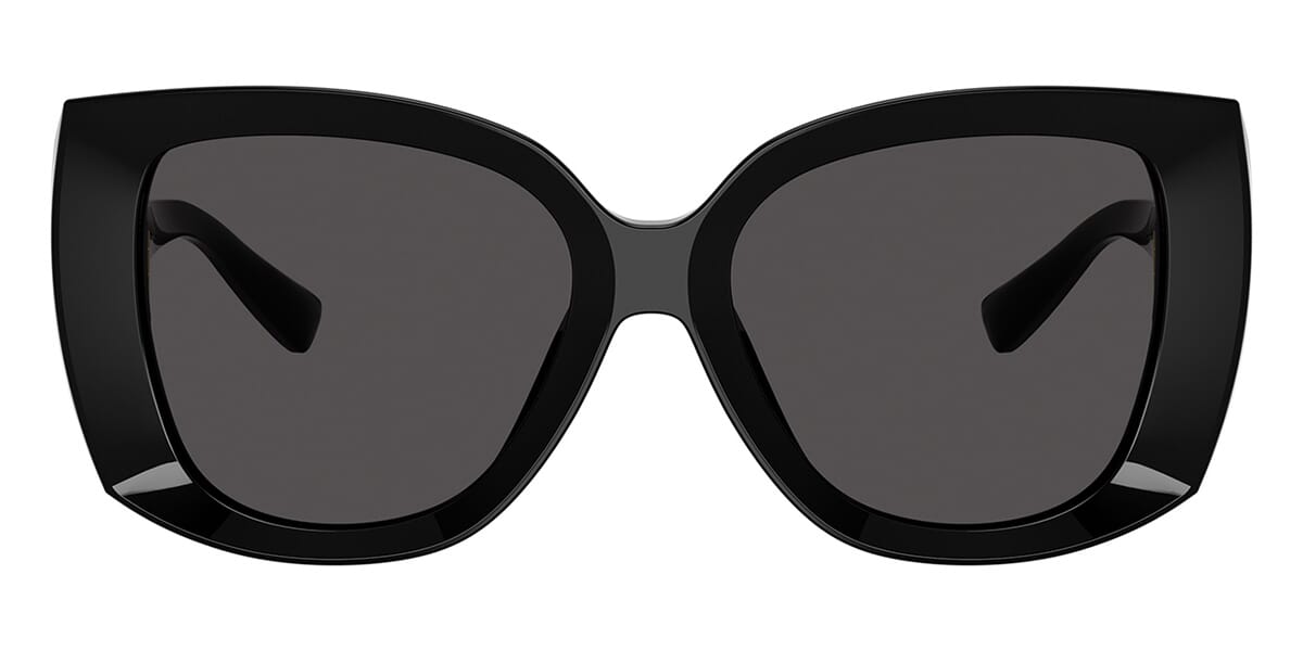 This square Dolce&Gabbana sunglass comes in a black frame with dark grey lenses.