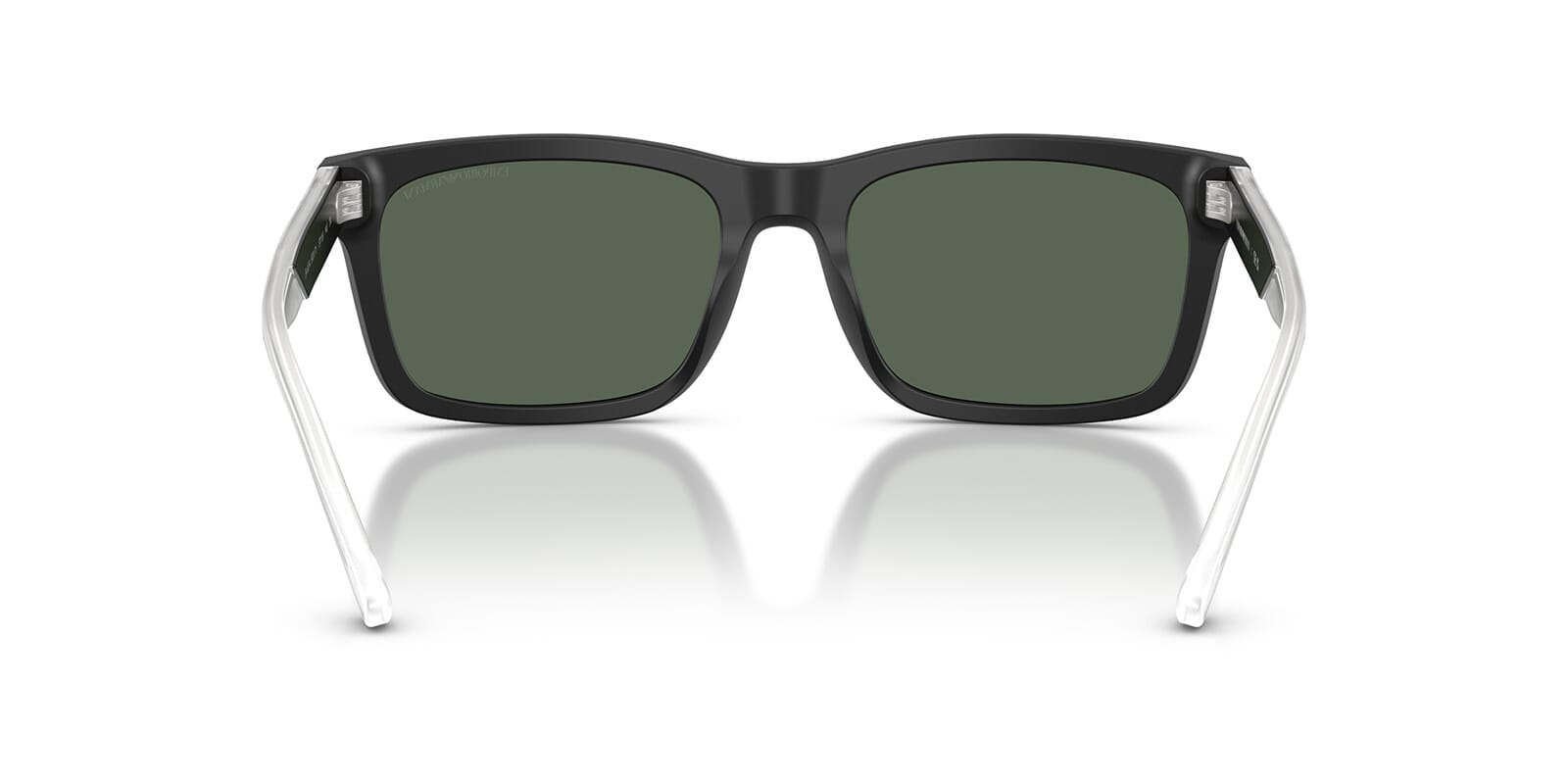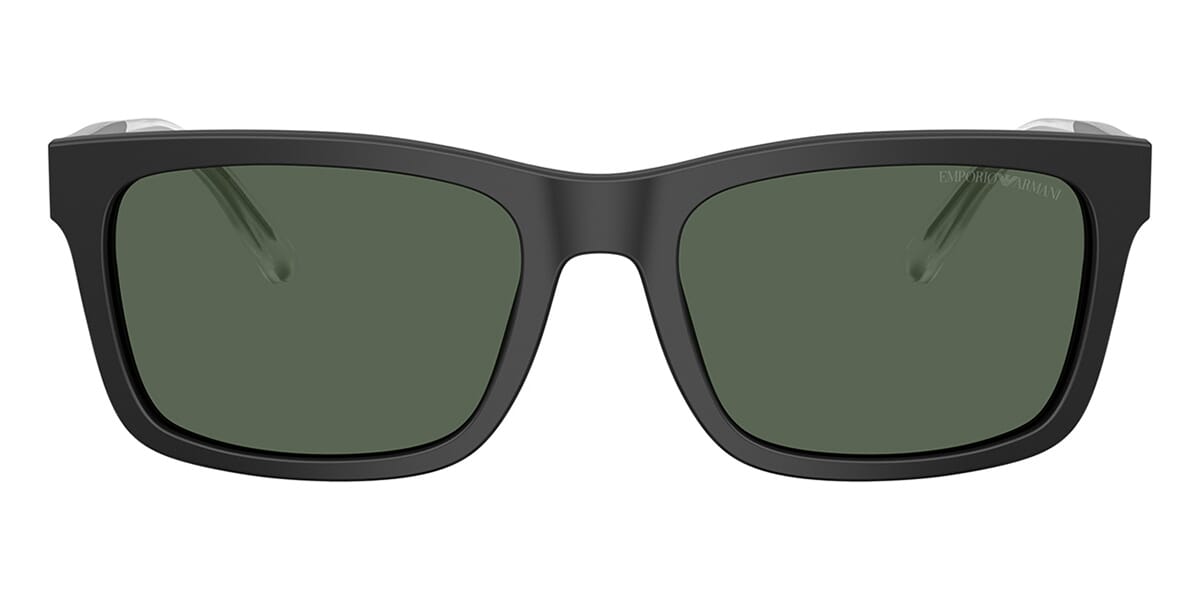 This rectangular Emporio Armani sunglass comes in a matte black frame with dark green lenses.