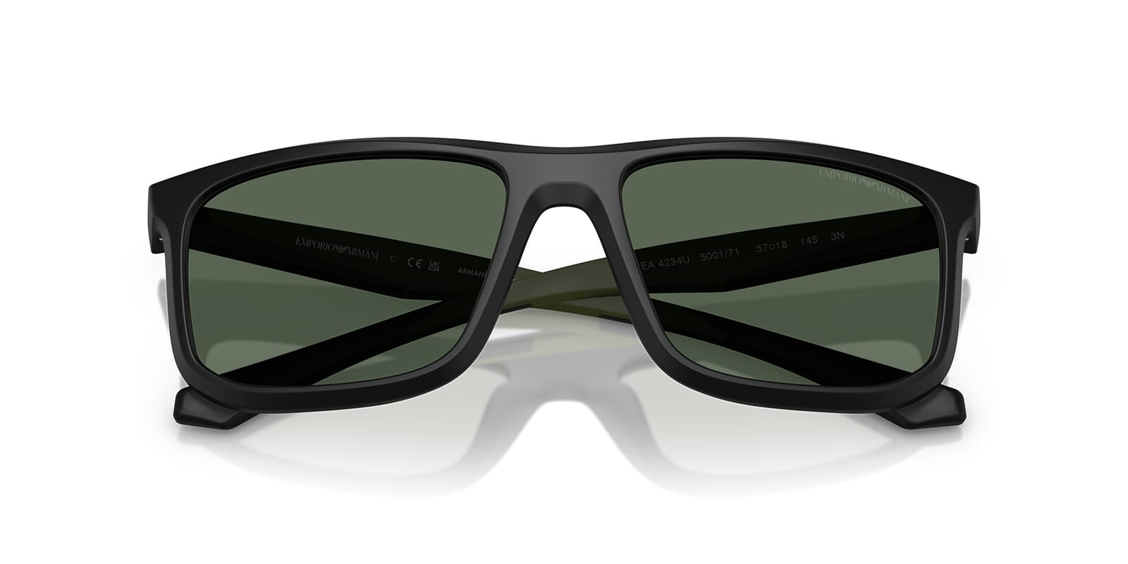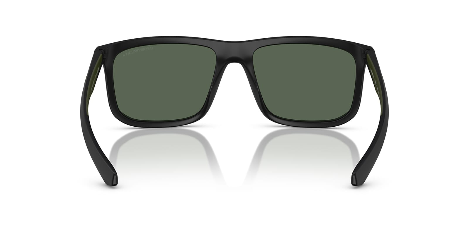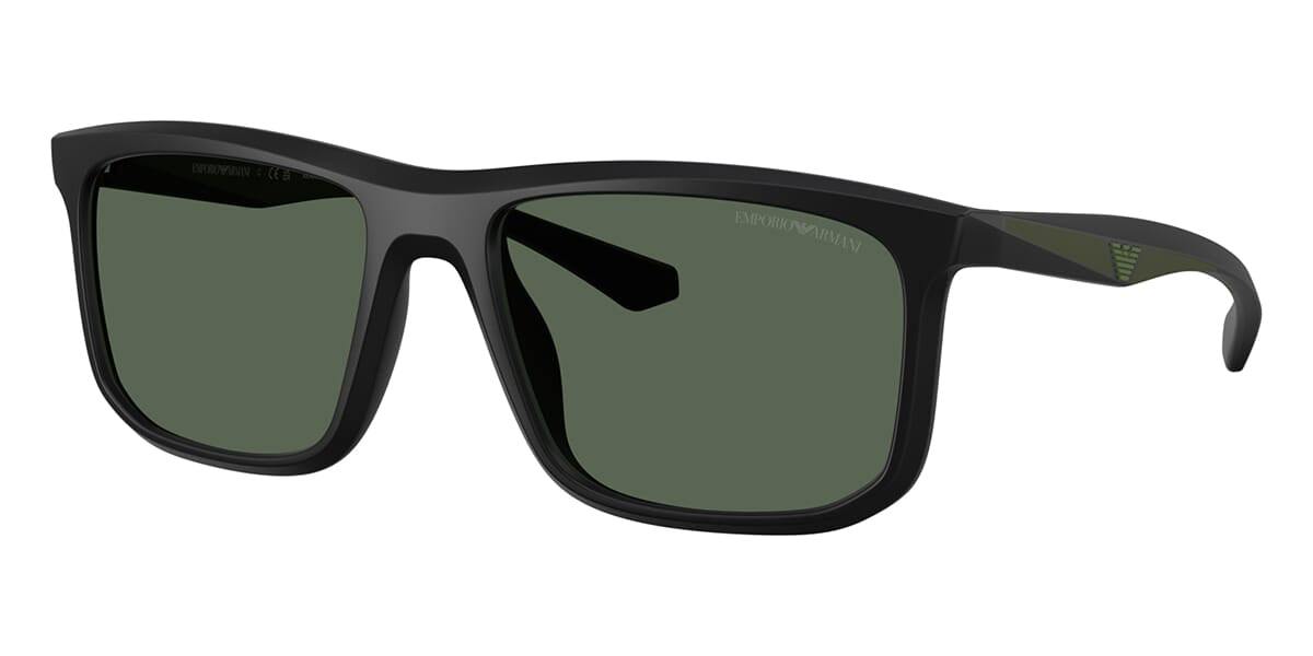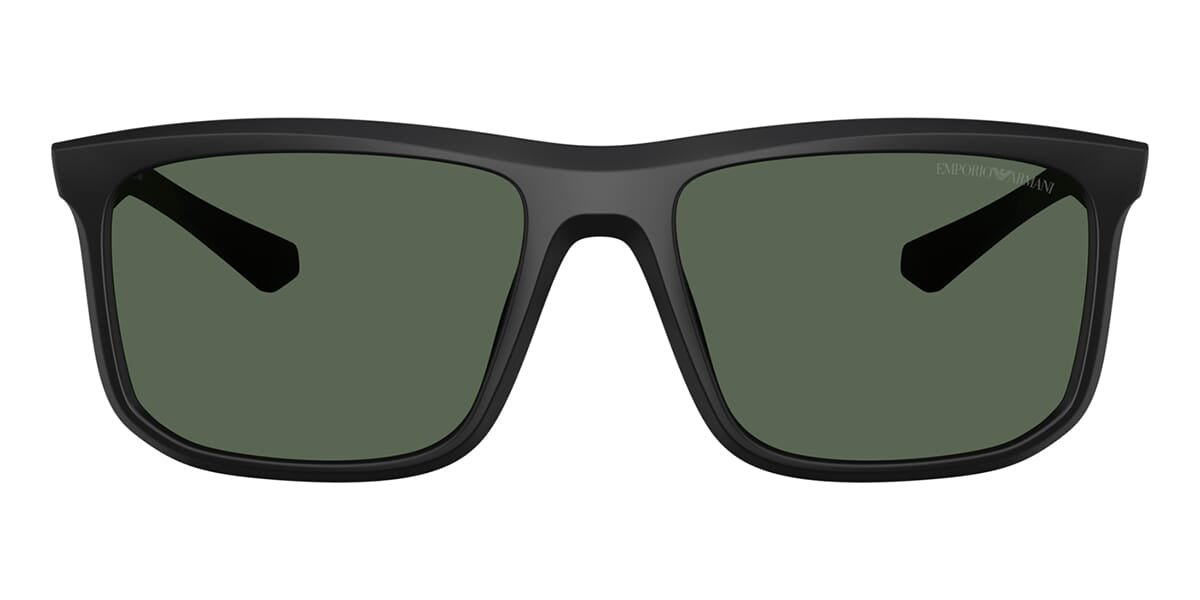 This square Emporio Armani sunglass comes in a matte black frame with dark green lenses.