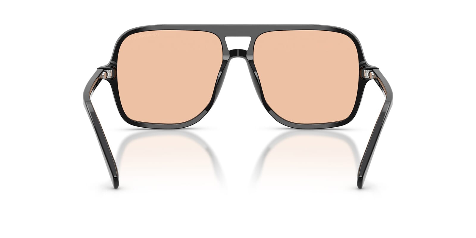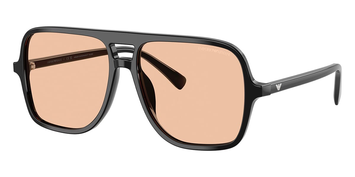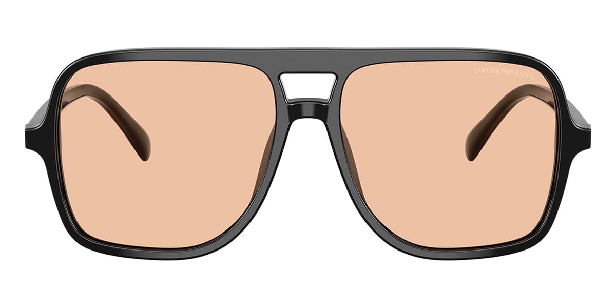 This aviator Emporio Armani sunglass comes in a shiny black frame with light orange lenses.