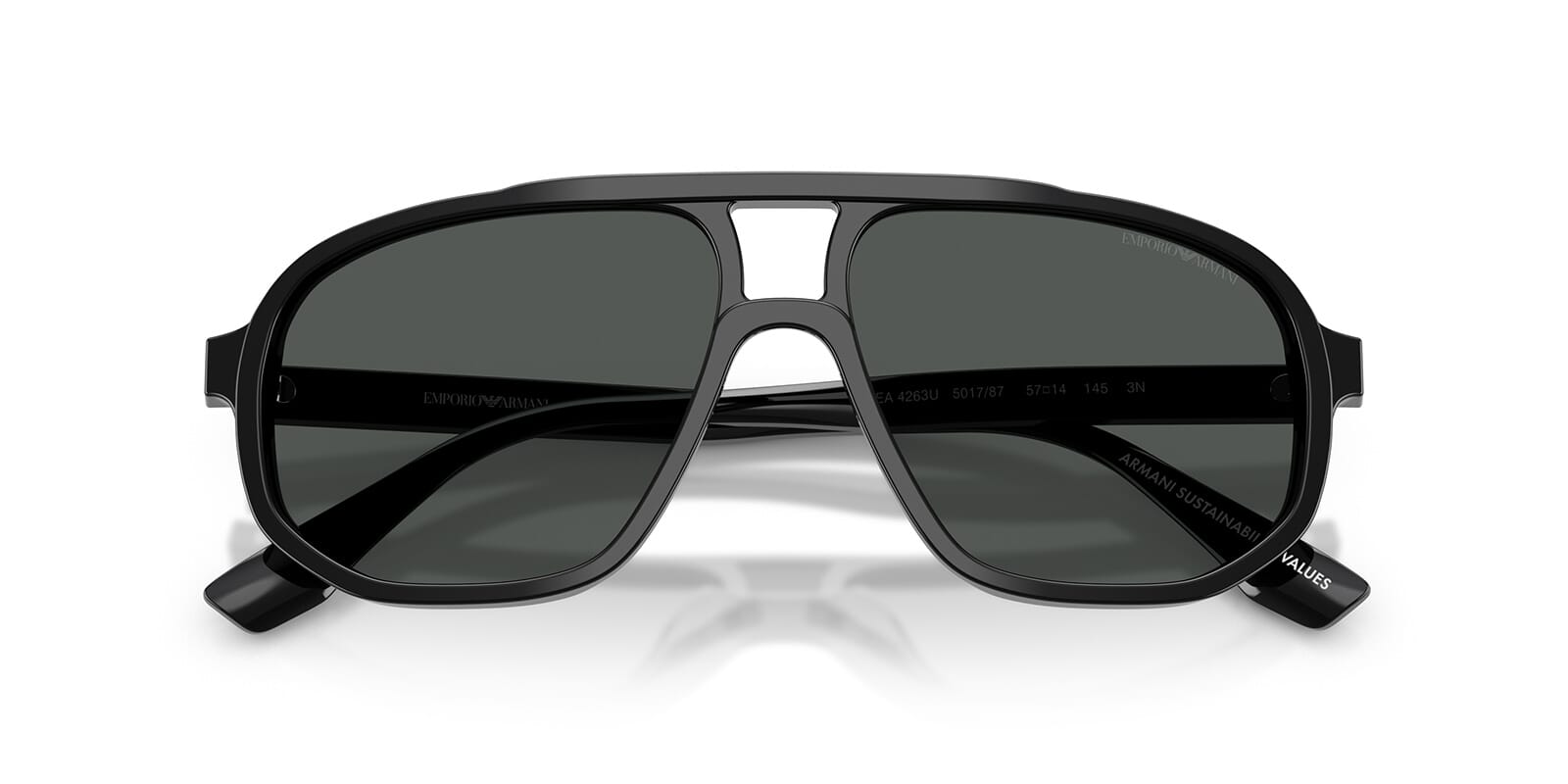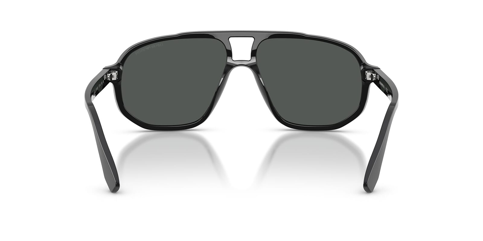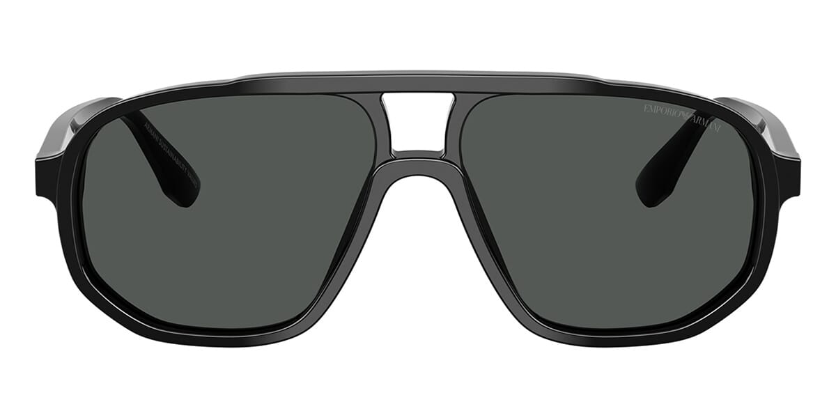 This aviator Emporio Armani sunglass comes in a shiny black frame with dark grey lenses.