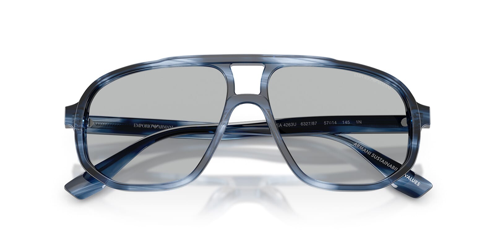 This aviator Emporio Armani sunglass comes in a striped dark blue frame with light grey lenses.