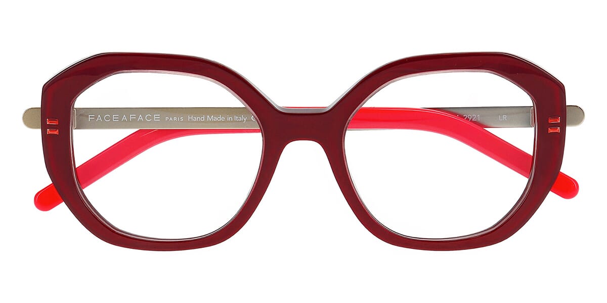 This square Face A Face optical comes in a bordeau red with gold and fuschia red frame.