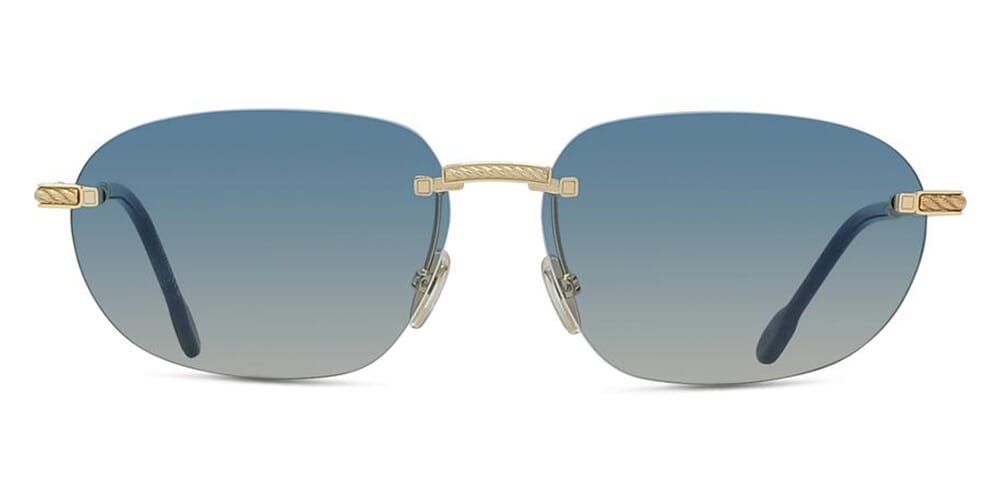 This square Fred sunglass comes in a shiny gold frame with blue gradient lenses.