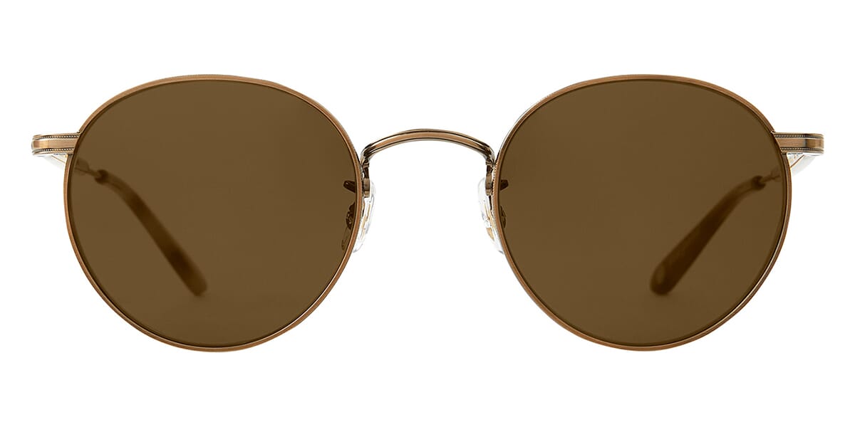 This square Garrett Leight sunglass comes in a ember tortoise with antique gold frame with brown lenses.