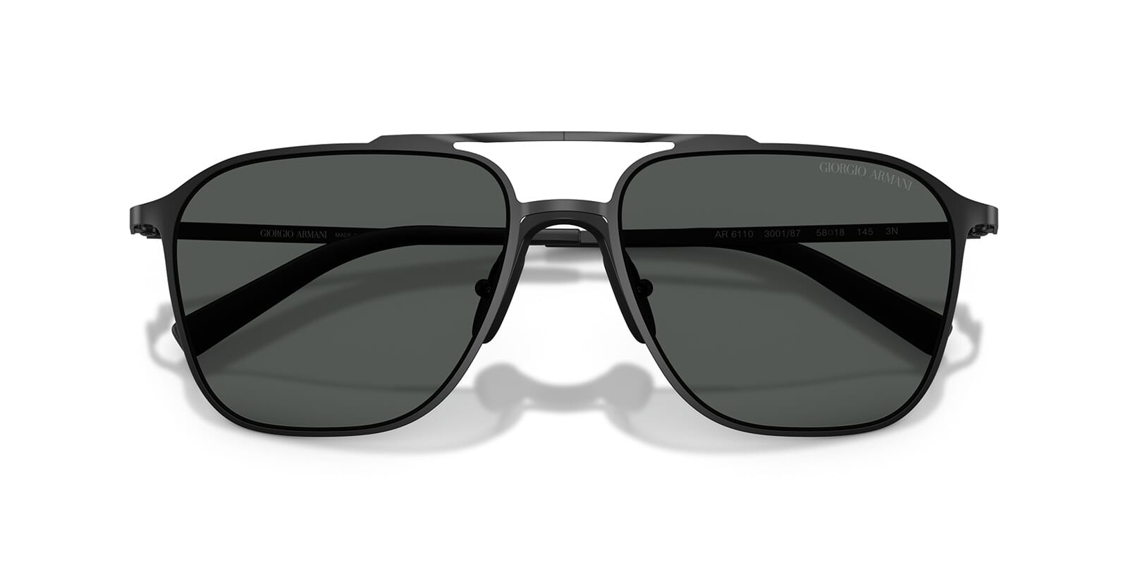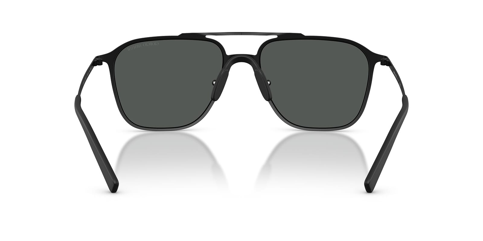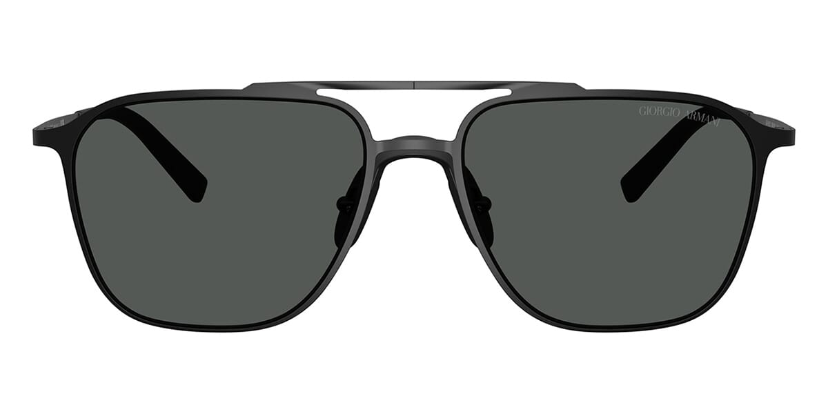 This square Giorgio Armani sunglass comes in a matte black frame with grey lenses.