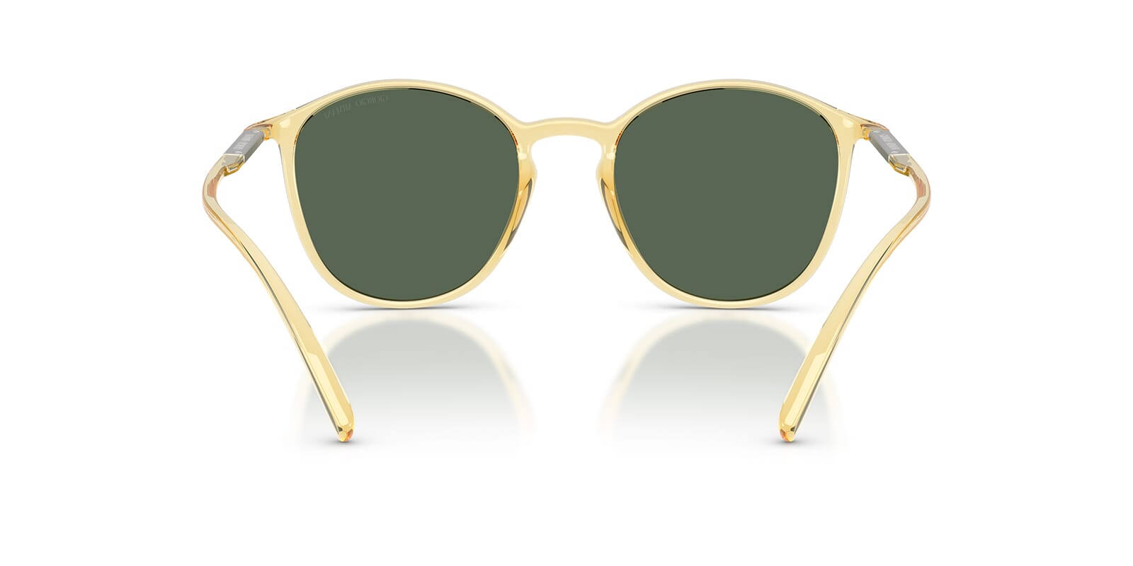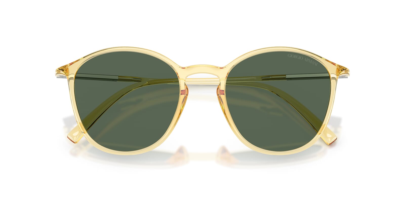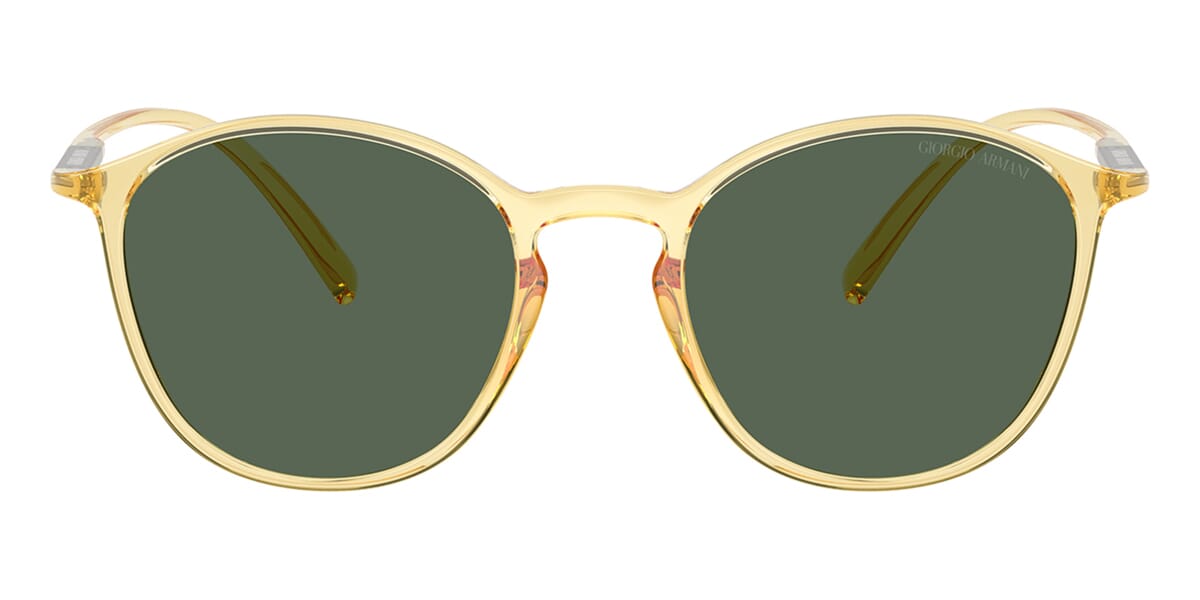 This round Giorgio Armani sunglass comes in a honey frame with dark green lenses.