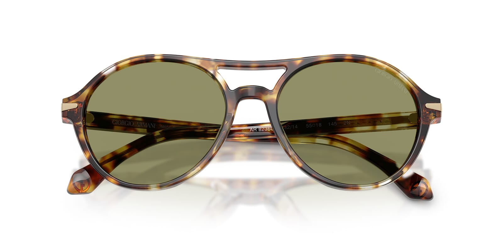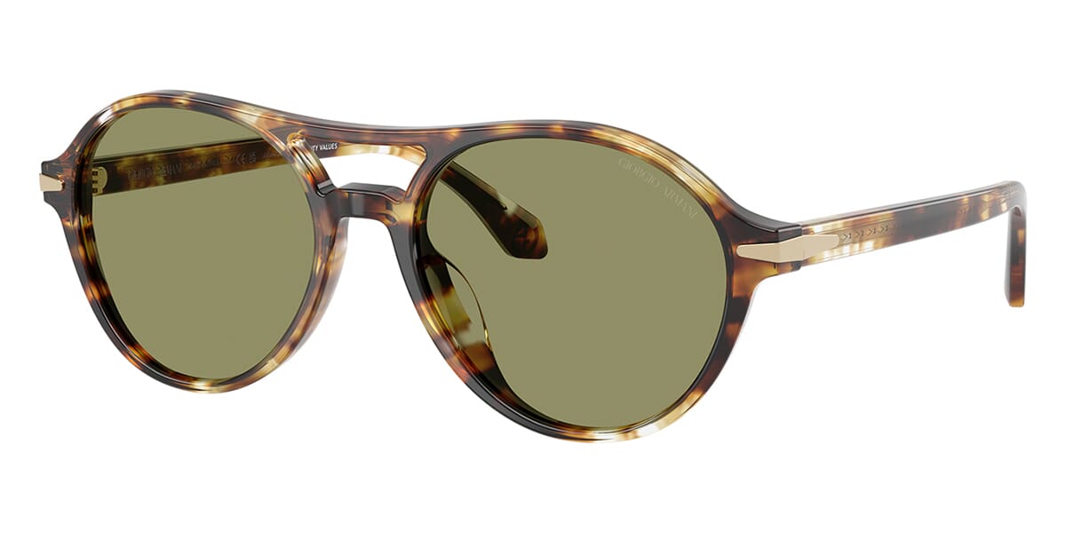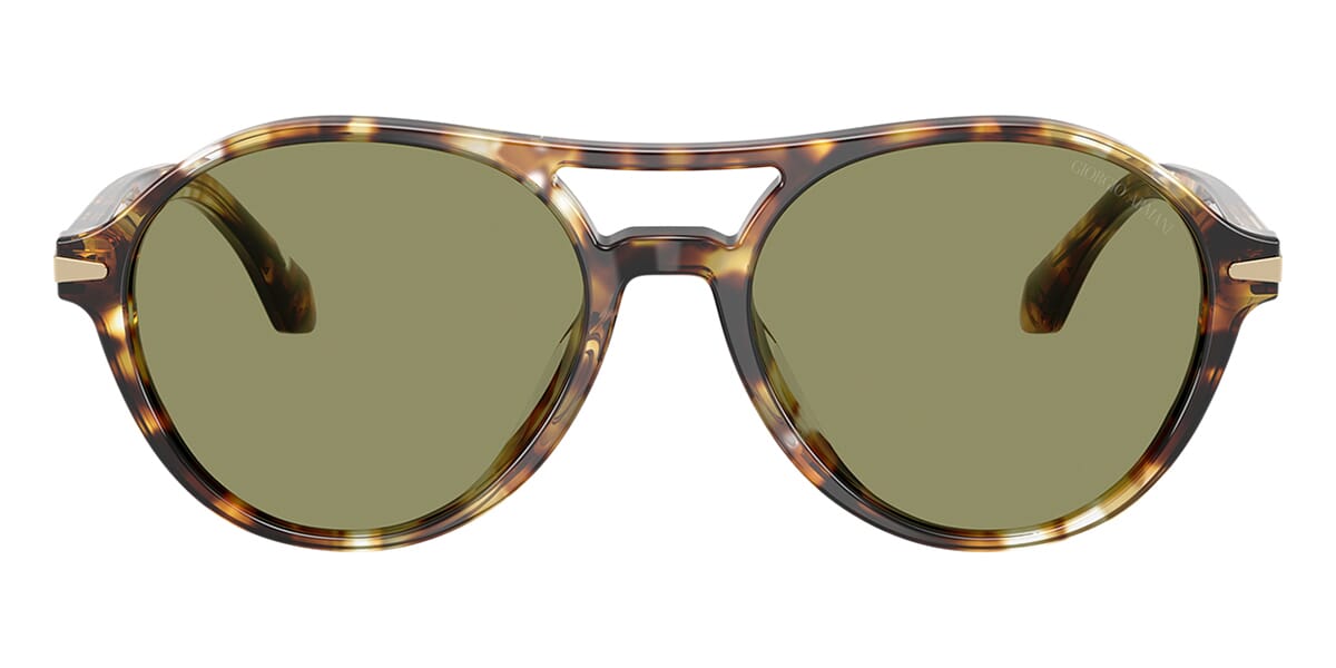 This round Giorgio Armani sunglass comes in a yellow havana frame with green lenses.