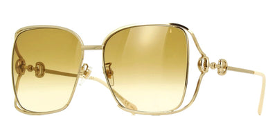 This square Gucci sunglass comes in a gold frame with grey light mirrored lenses and is enhanced by the addition of the iconic Horsebit motif featured on gold temples, paying homage to the House's equestrian heritage.