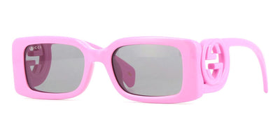 These Gucci rectangular interlocking G logo sunglasses come in a shiny black frame with grey smoke lenses. These frames are a main focal point in Gucci's SS23 eyewear campaign.