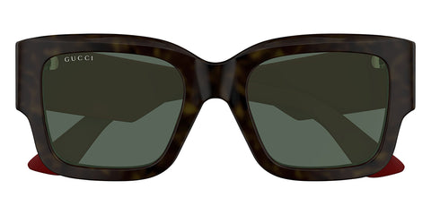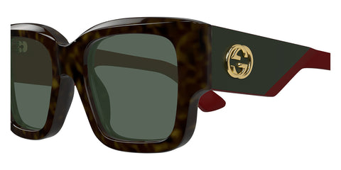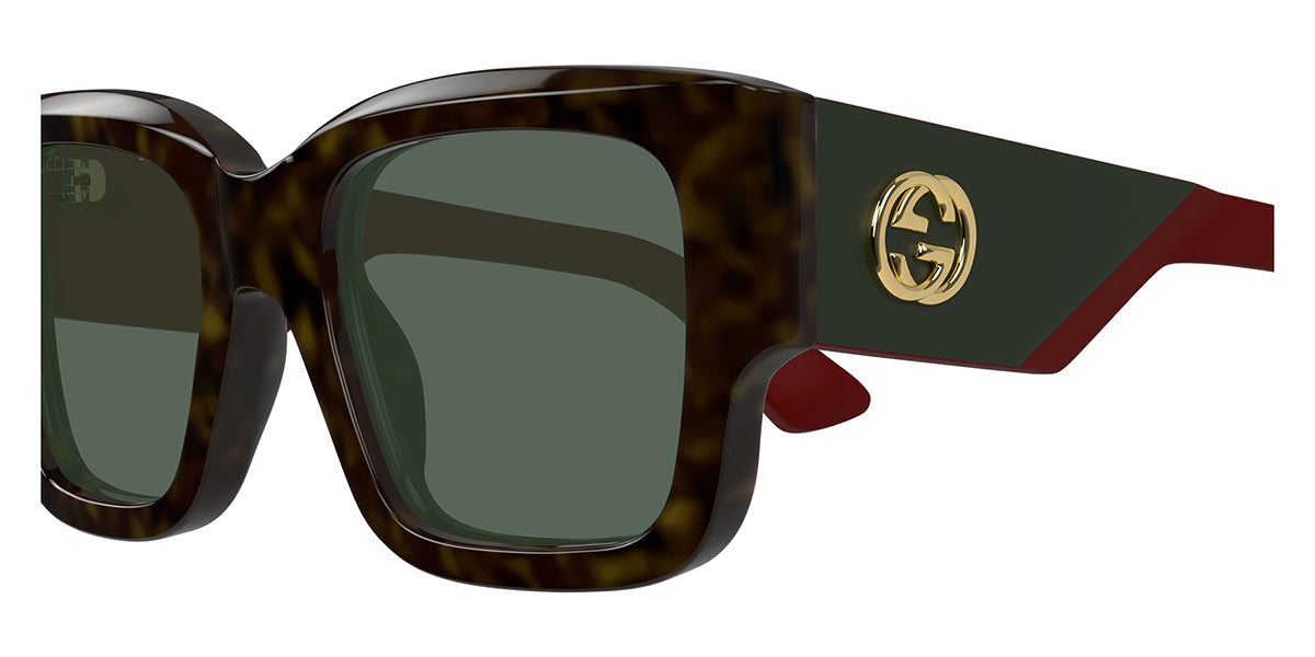 This square Gucci sunglass comes in a havana with red and gold frame with green lenses.