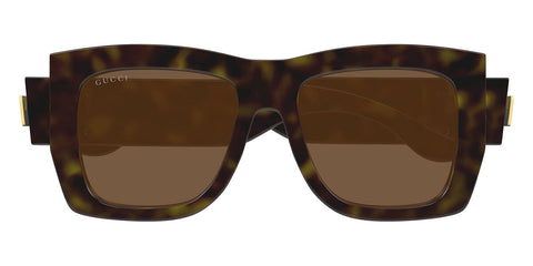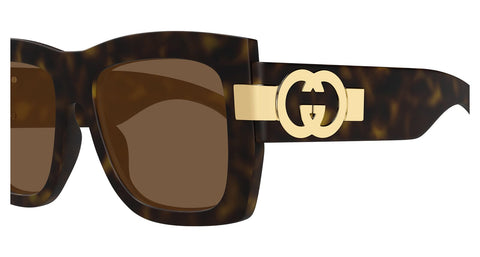 This square Gucci sunglass comes in a dark brown havana with gold frame with brown lenses.