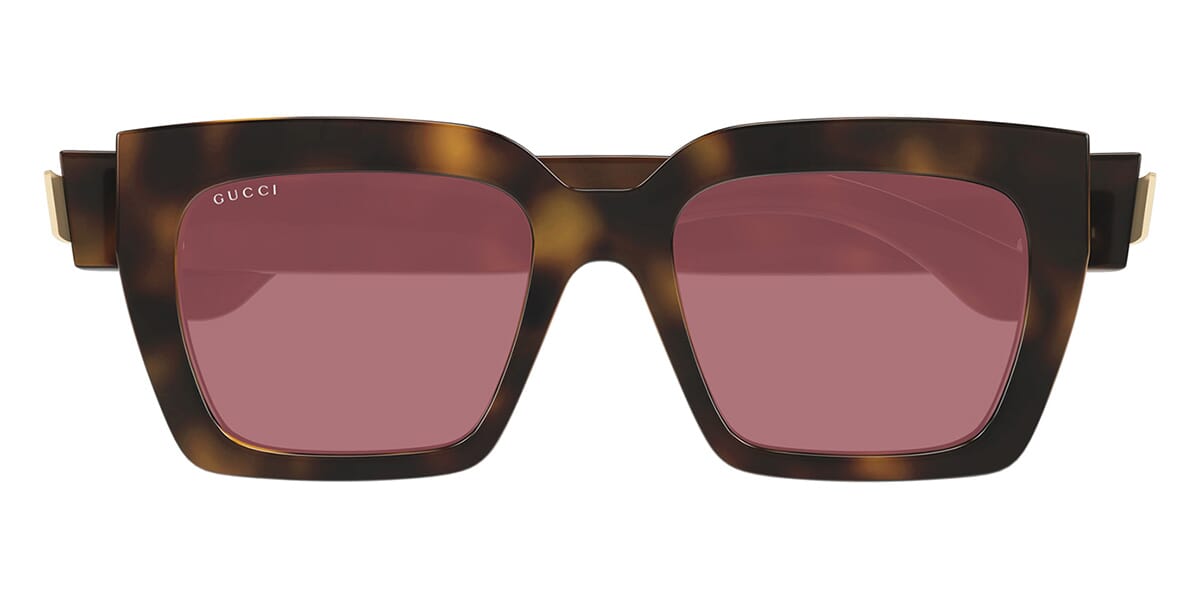 This square Gucci sunglass comes in a havana with gold frame with violet lenses.