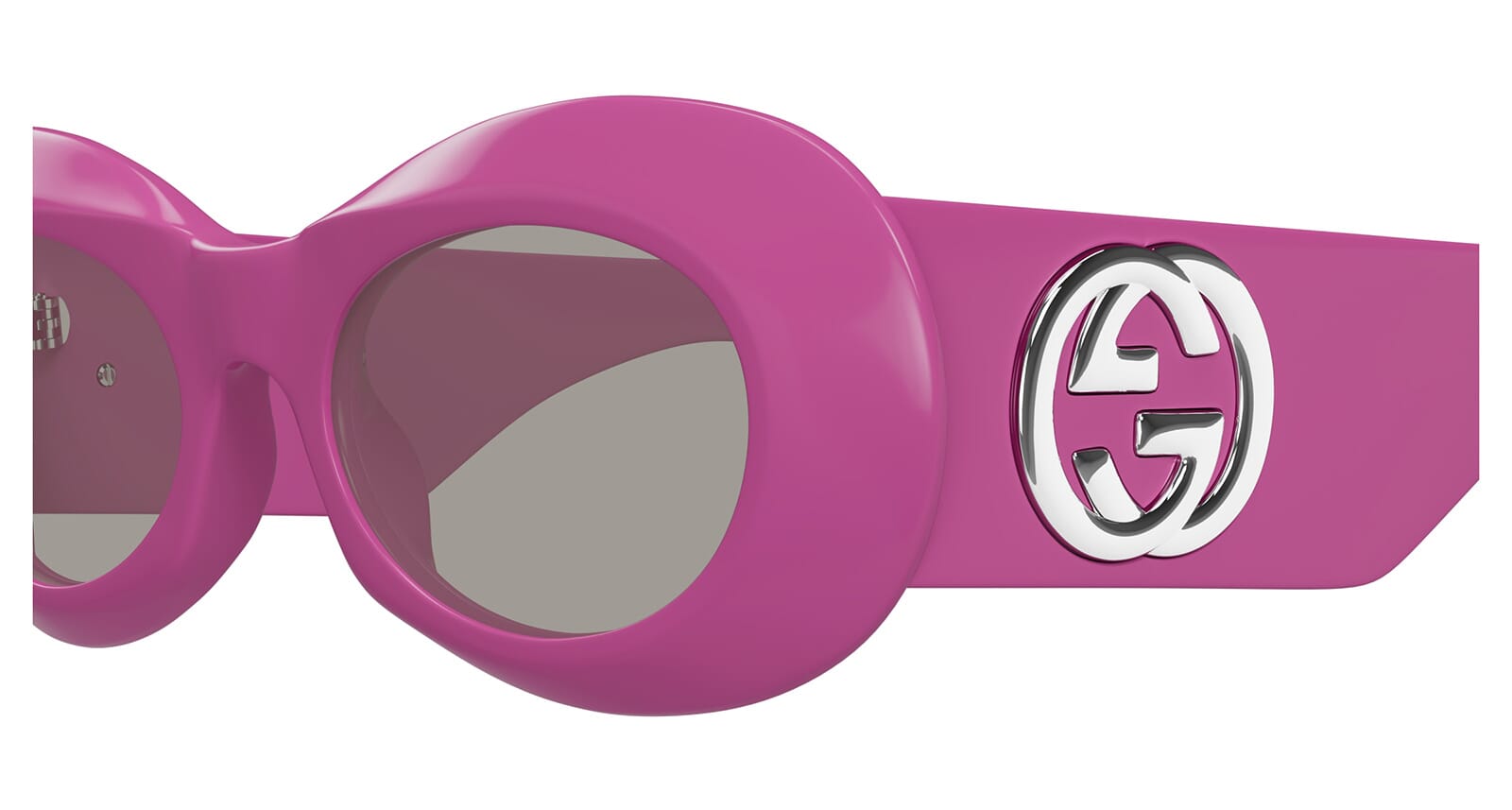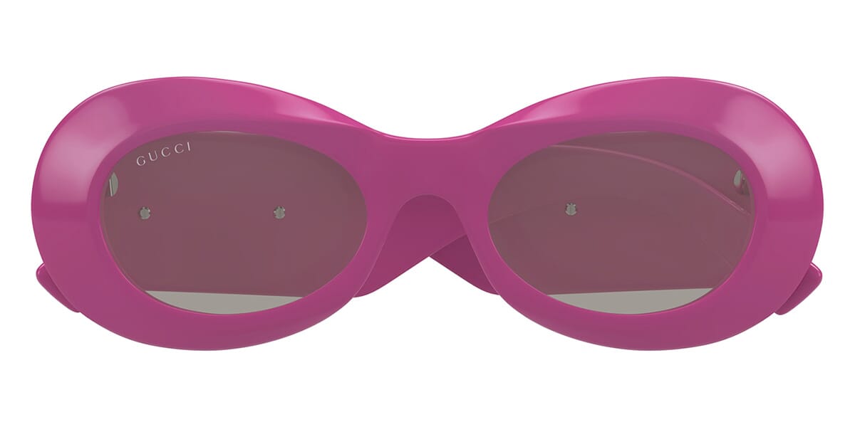 This square Gucci sunglass comes in a fuschia frame with grey lenses.