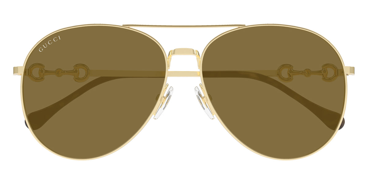 This aviator Gucci sunglass comes in a gold frame with brown lenses.