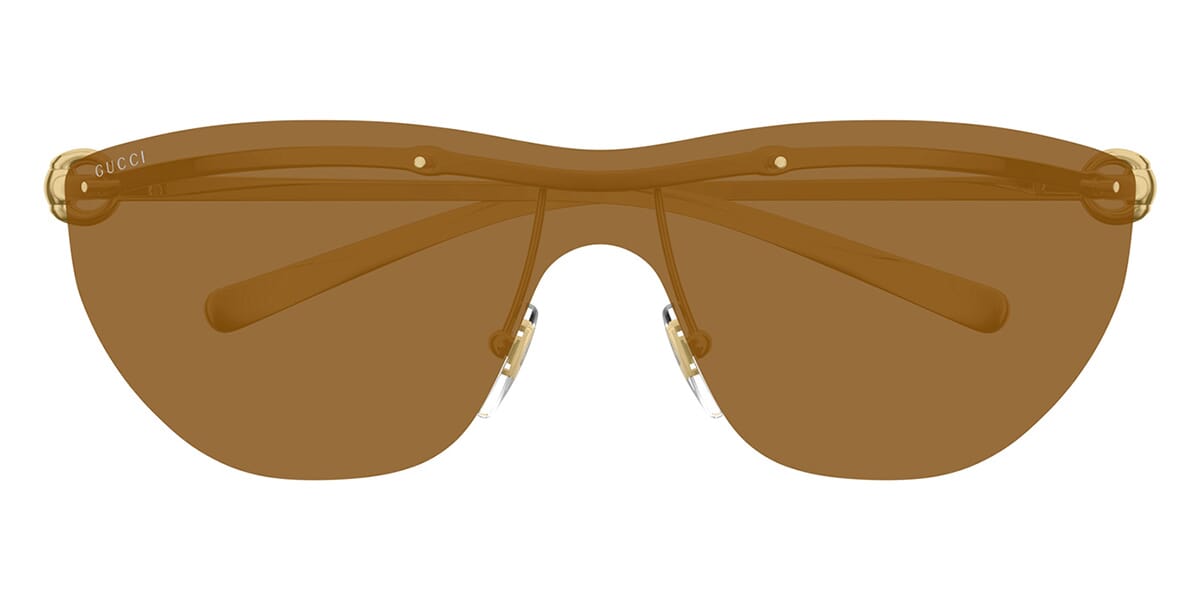 This shield Gucci sunglass comes in a gold frame with brown lenses.