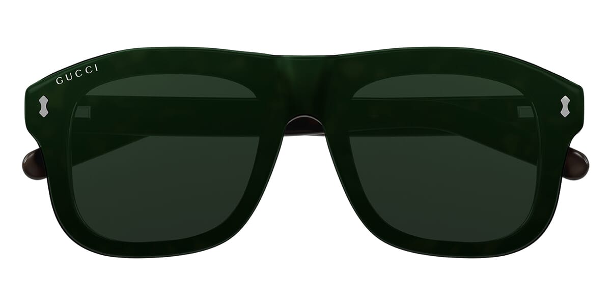This square Gucci optical comes in a shiny dark havana frame with dark green with light mirror lenses.