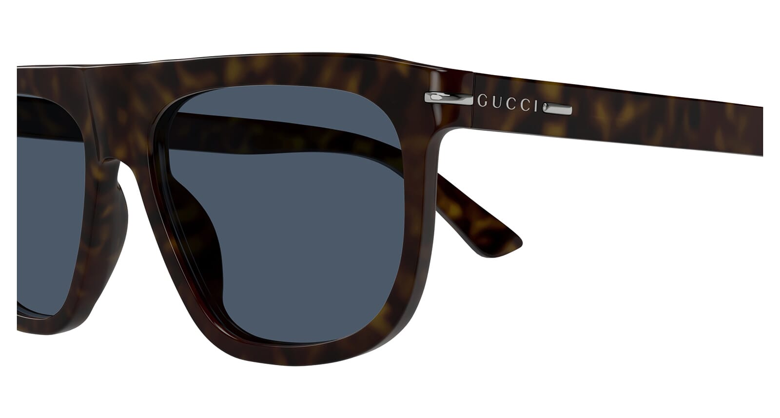 This square Gucci sunglass comes in a havana frame with blue grey lenses.