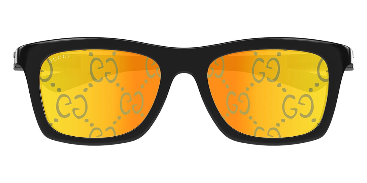 This square Gucci sunglass comes in a black with green frame with yellow with logo orange flash mirror lenses.