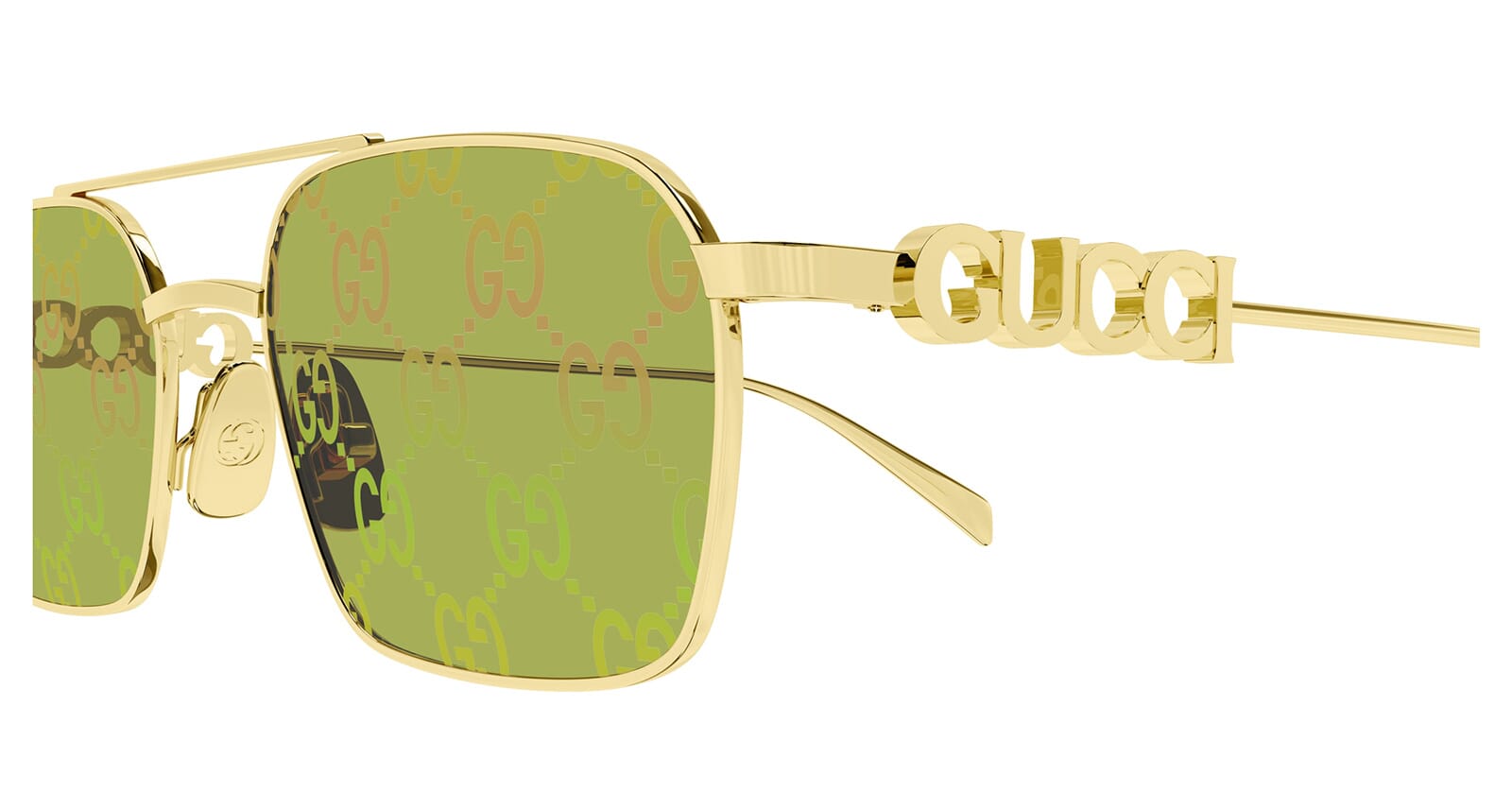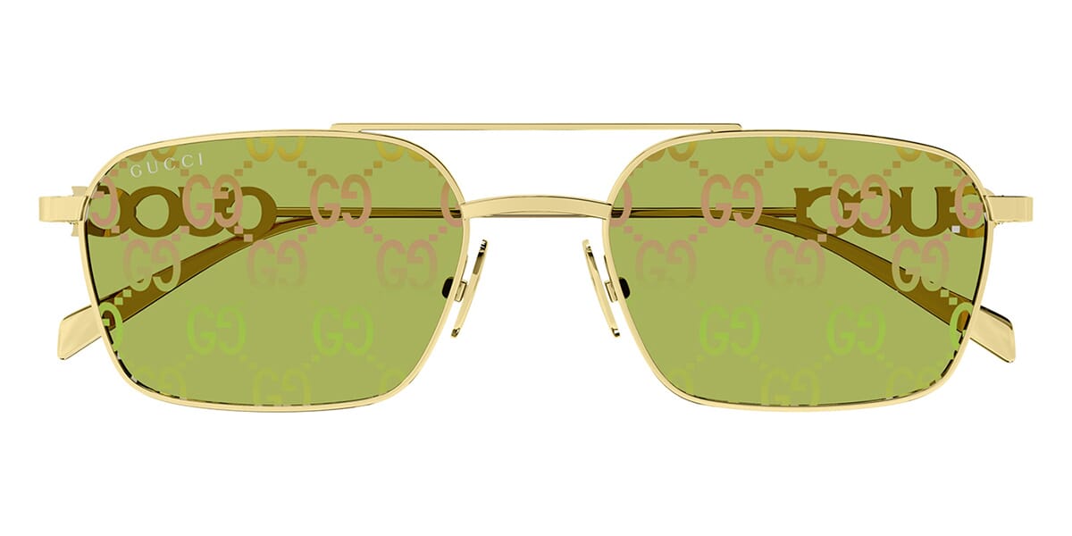 This square Gucci sunglass comes in a gold frame with green lenses.