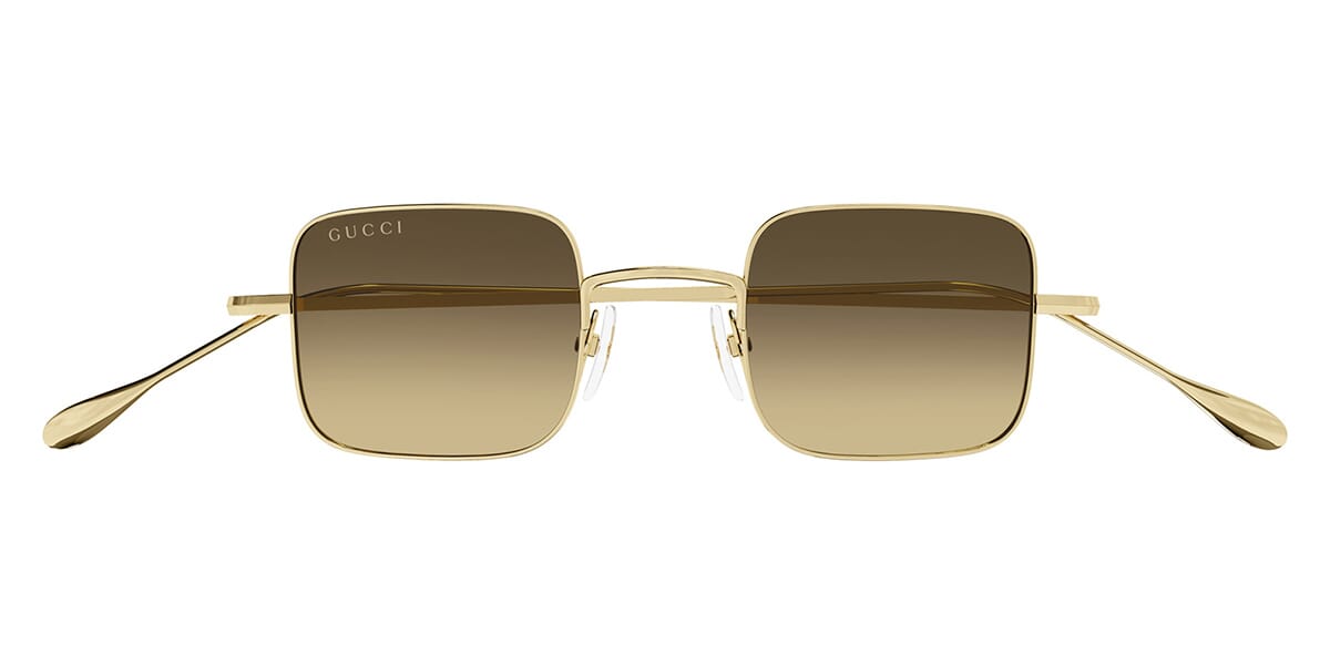This square Gucci sunglass comes in a gold frame with brown lenses.