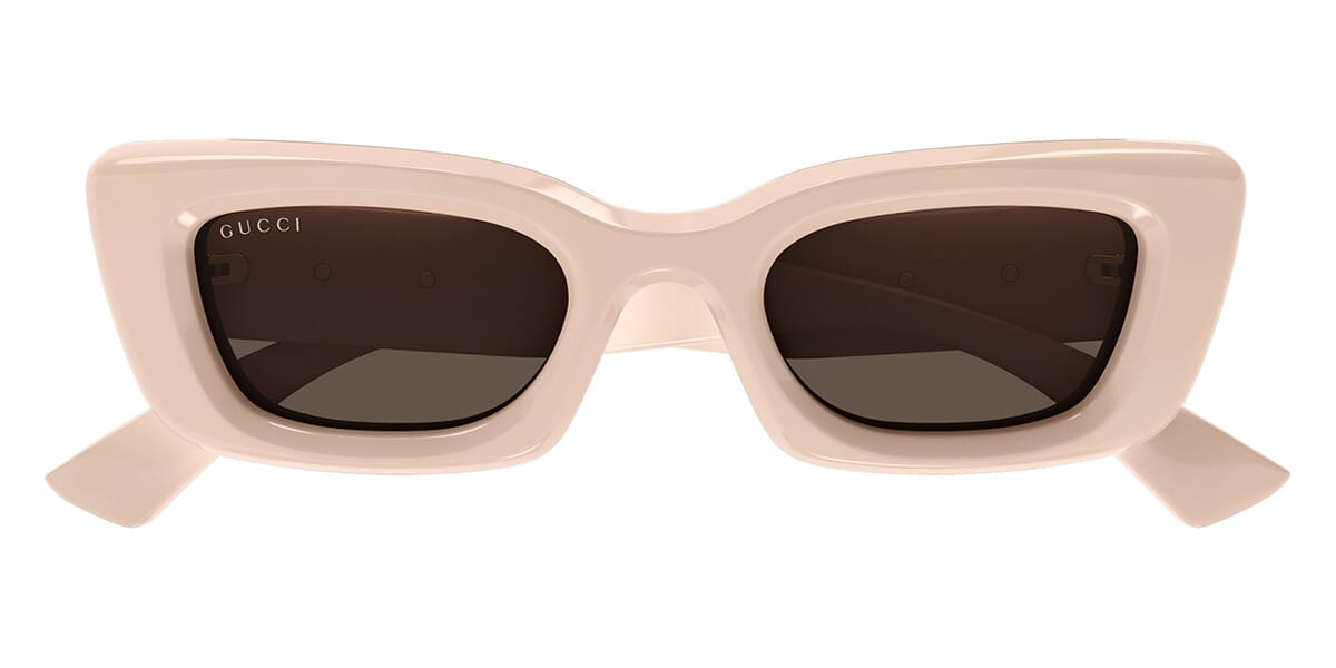 This cat eye Gucci sunglass comes in a pink frame with brown lenses.