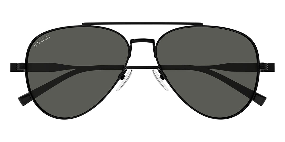 This aviator Gucci sunglass comes in a shiny black frame with grey lenses.