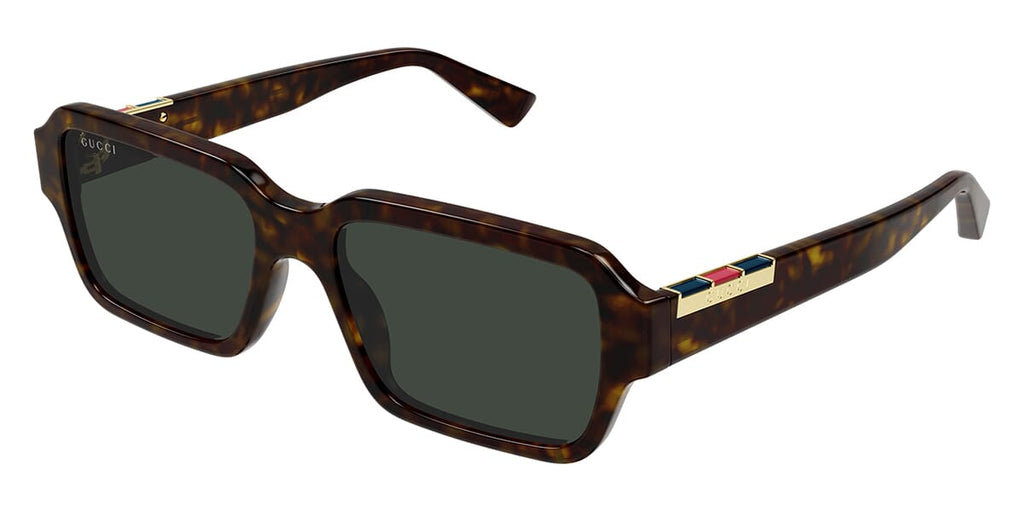 This square Gucci sunglass comes in a havana frame with green lenses.