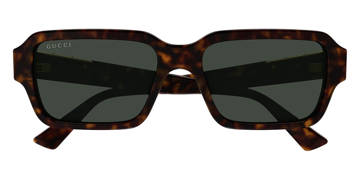 This square Gucci sunglass comes in a havana frame with green lenses.