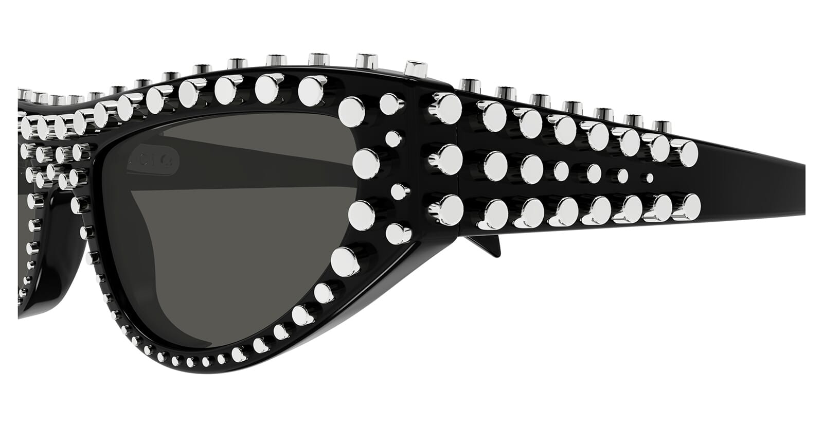 This cat eye Gucci sunglass comes in a shiny black with silver stud detail frame with grey lenses.