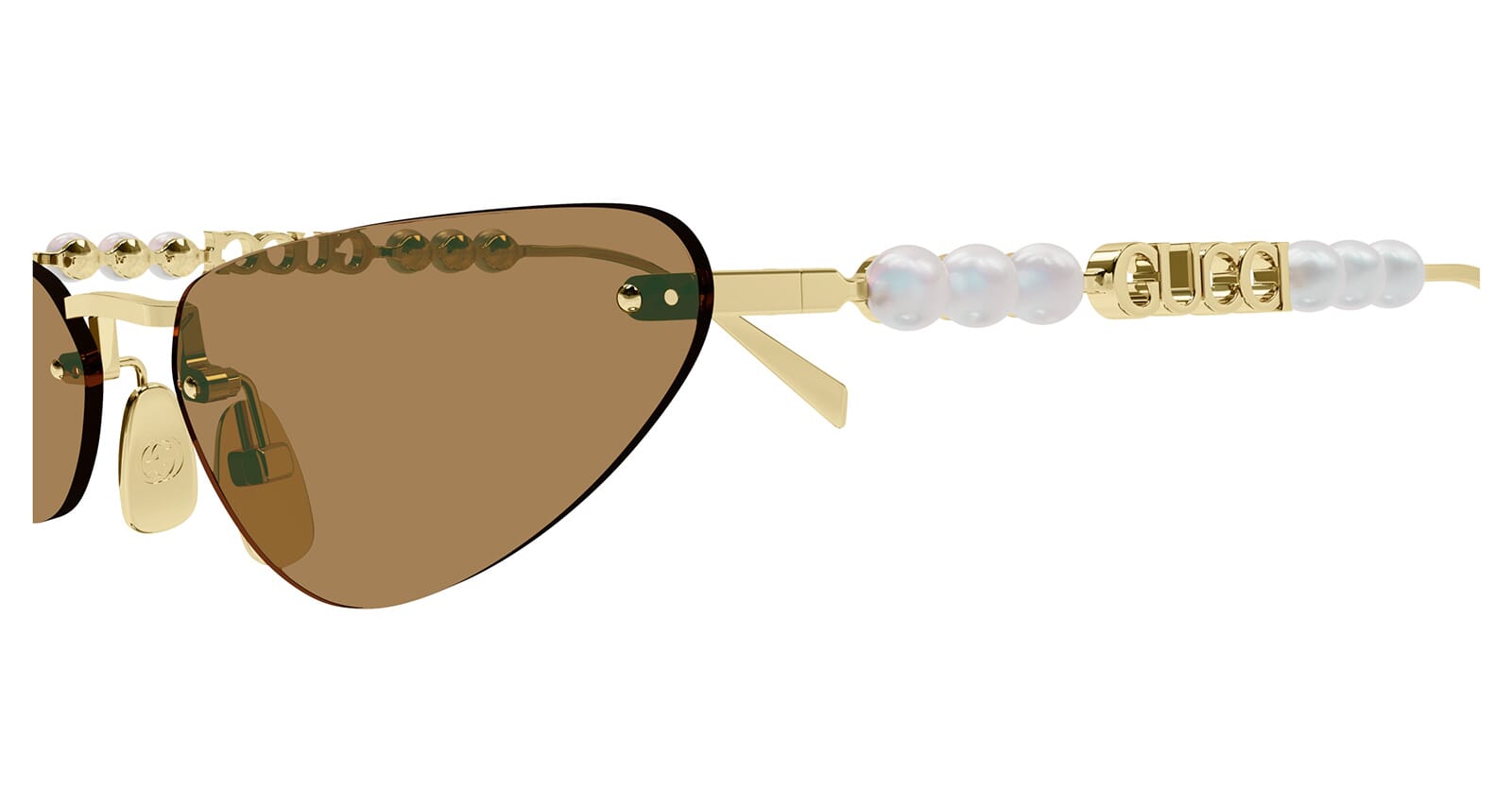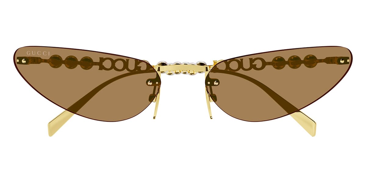 This cat eye Gucci sunglass comes in a gold frame with brown lenses.
