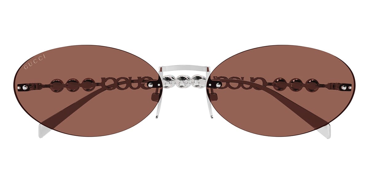 This square Gucci sunglass comes in a shiny silver frame with brown lenses.