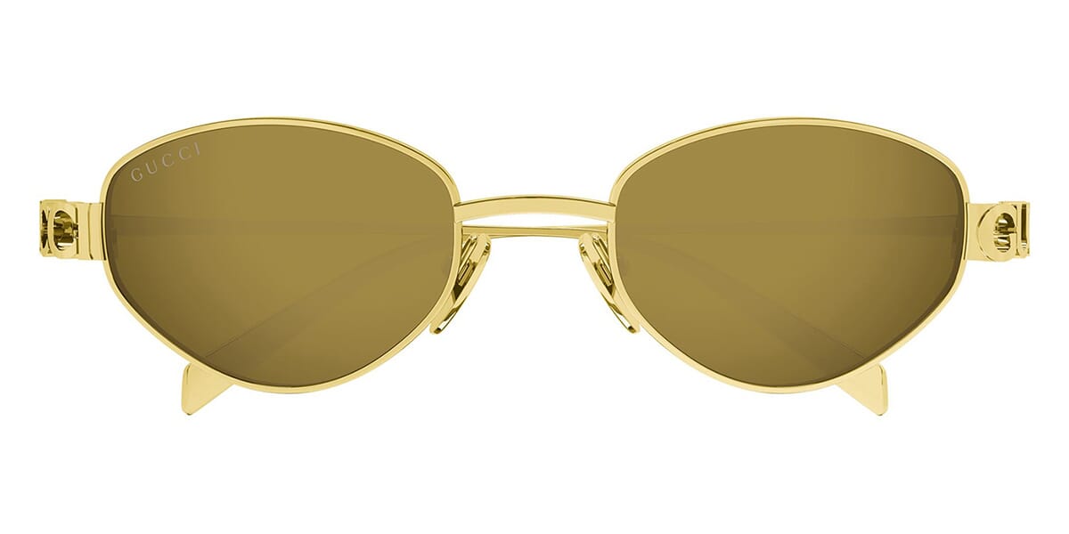 This cat eye Gucci sunglass comes in a shiny gold frame with brown with bronze mirror lenses.