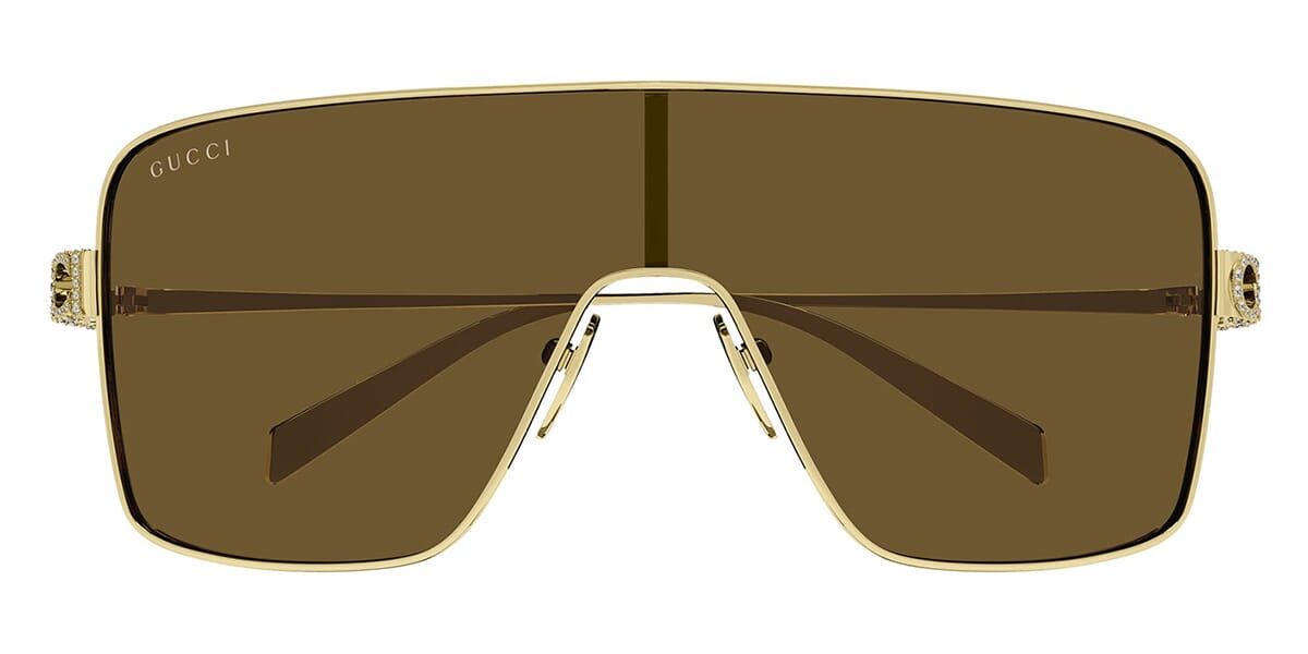 This shield Gucci sunglass comes in a shiny gold frame with brown with light mirror lenses.