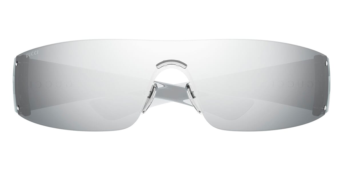 This wraparound Gucci sunglass comes in a shiny silver frame with grey with light mirror lenses.