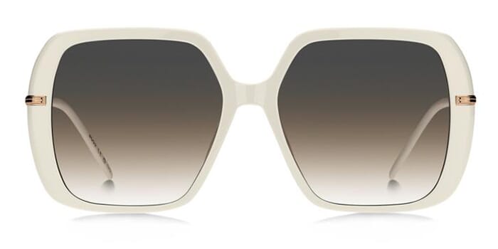 This square Hugo Boss sunglass comes in a white with gold frame with grey to brown to clear double shade gradient lenses.