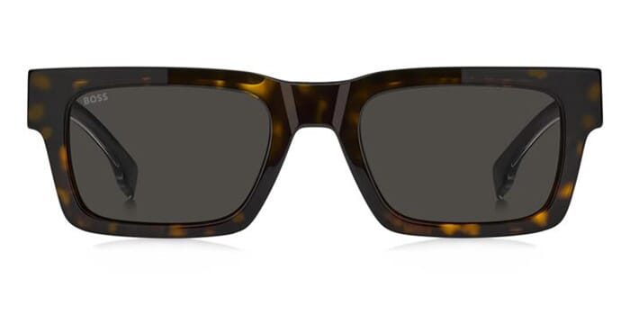 This square Hugo Boss sunglass comes in a dark havana with black frame with grey lenses.