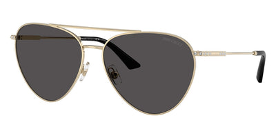 This aviator Jimmy Choo sunglass comes in a pale gold frame with dark grey lenses.