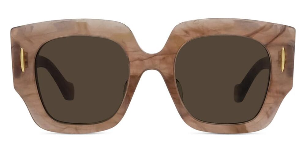 This square Loewe sunglass comes in a shiny pearl rose havana frame with brown lenses.