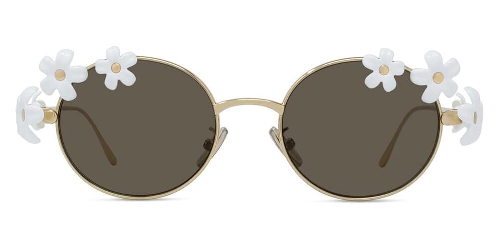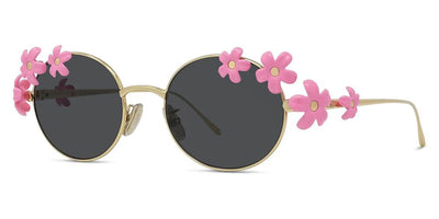 This round Loewe sunglass comes in a shiny gold and colored flowers frame with brown with light mirror lenses.